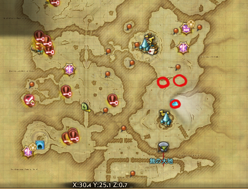 旅立ちの宿の上の赤丸付近(下の赤丸X30.5 Y25.1)で採掘師で掘ります~♪こちらもグルグル回りながら掘っちゃって!Lv70の岩場でイエローアルメンの他にも掘れちゃいます!