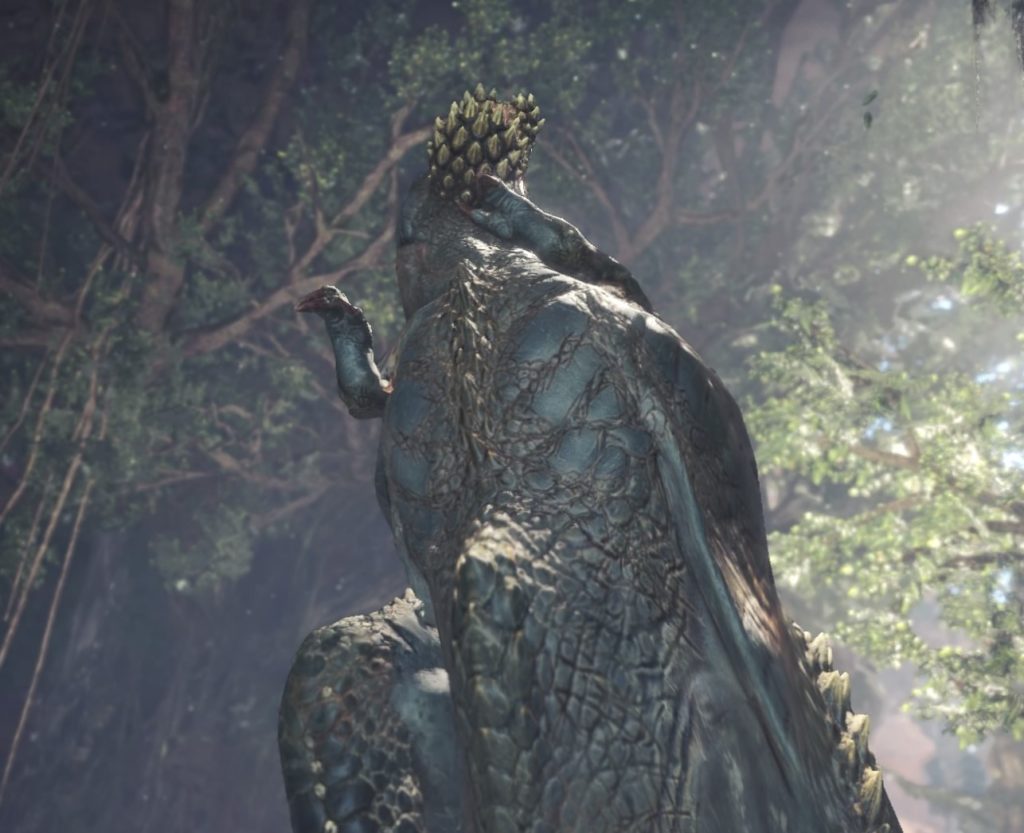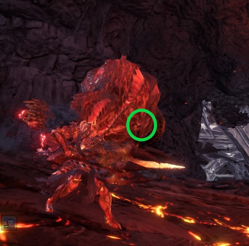 ・狙う箇所は頭ではなく、腹の部分です。イビルジョーはお腹の出っ張り部分が弱点となっており、頭よりも腹の部分がダメージが入りやすく、ダウンもとれやすくなっています( ..)φ