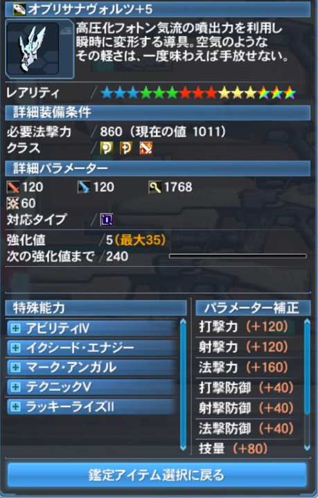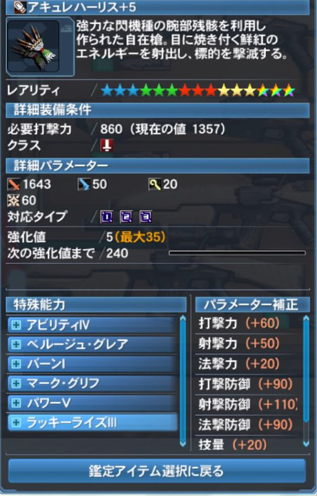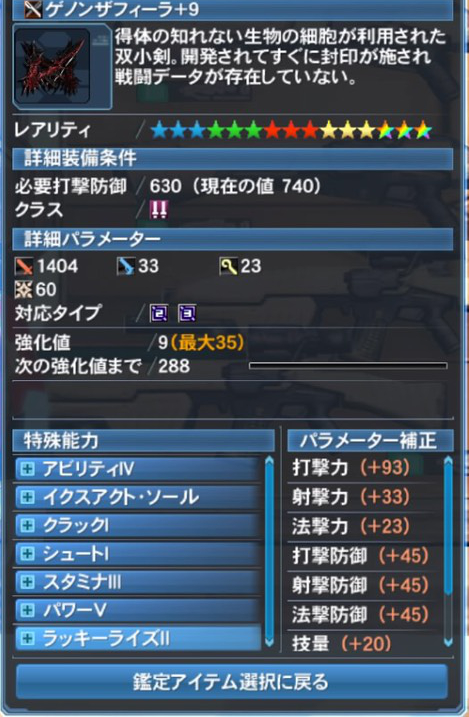 特殊能力因子:S1 月ノ黄閃 ジャストガード成功時に20秒間PP消費量を8%軽減。