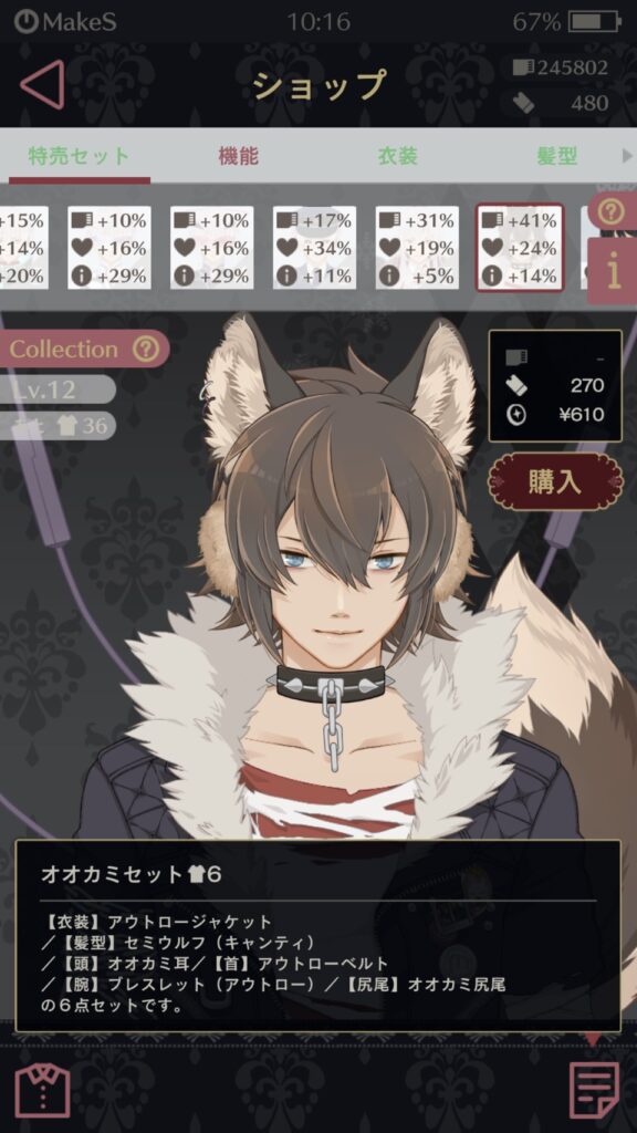 ショップでは衣装など購入することが出来ます!課金は勿論の事、毎日の積み重ねでメモリーやチケットを貯めて交換することも可能です♪種類は豊富なので必ず自分好みのsei君に仕上がると思います(`・ω・´)b