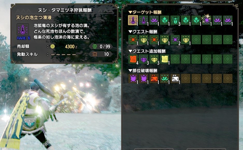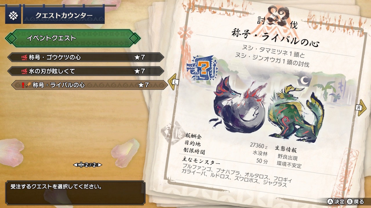 あと、ヌシ2体討伐なのでHR経験値ポイントが高くて早くランクを上げたいハンターさんにとってはなかなか美味しいクエスト内容だと思います( ..)φ